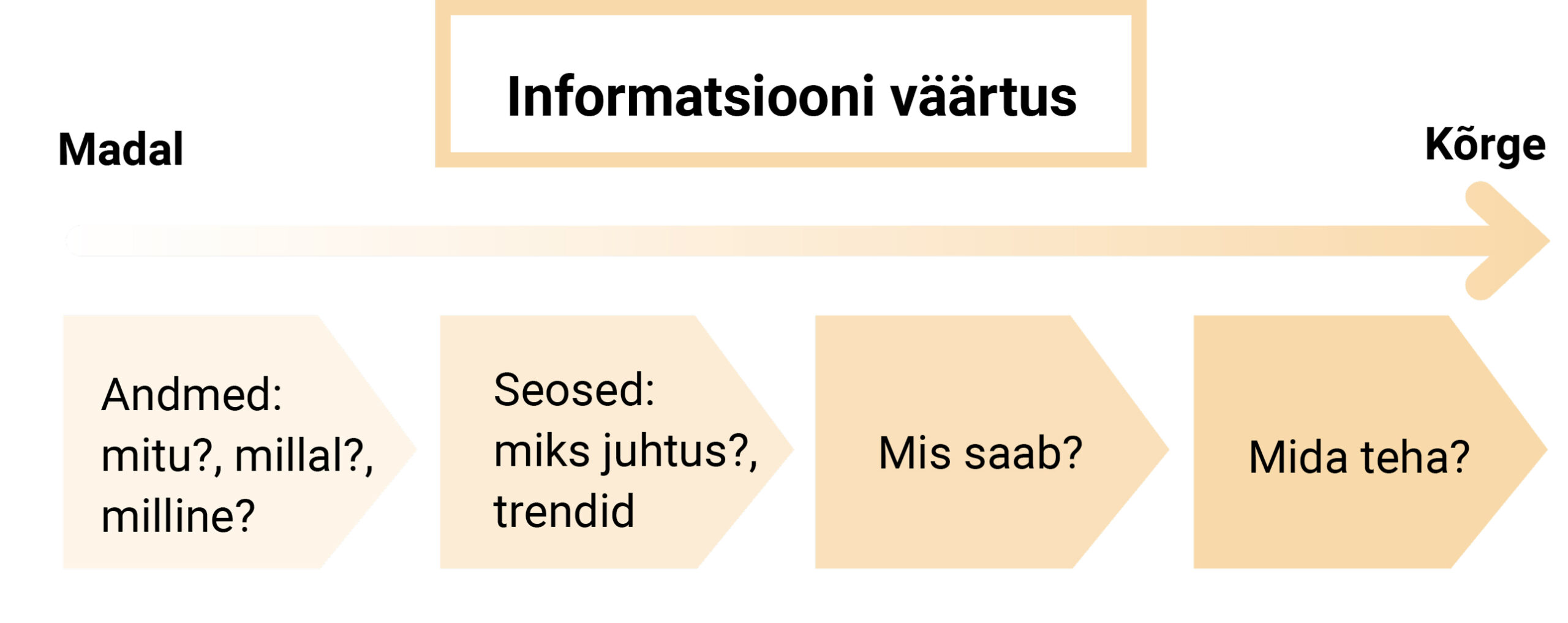 Võib täie veendumusega väita, et enamus äriotsused ettevõttes tehakse tuginedes informatsioonile. Mis aga on kõige olulisem, kuidas informatsioon hangitakse. Ja selle küsimuse juurde jõudes lähevadki arvamused ja kogemused laiali. Kõige lihtsamalt selgitades on põhjus selles, et informatsioonil on mitu taset, kus kõige madalamal tasemel me räägime andmetest ja kõige kõrgemal tasemel on tegu andmete analüüsi põhjal tehtud järeldustest (vt joonis).